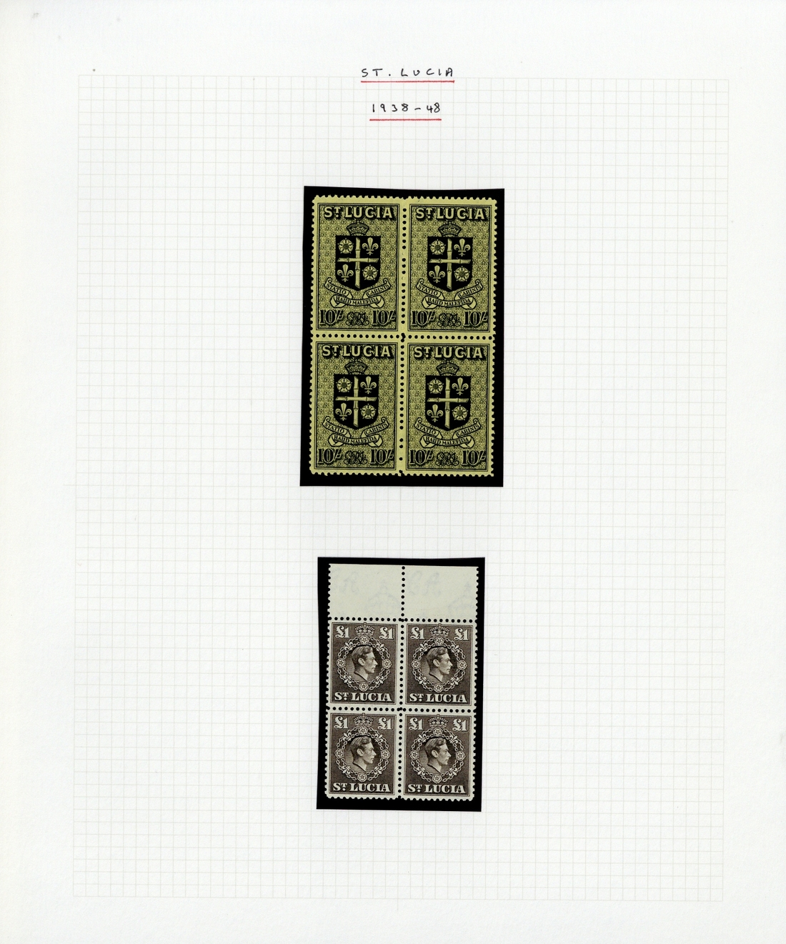 1937 Coronation set, 1938-48 set with the listed perf. varieties, 1946 Victory, 1948 Wedding, 1949 UPU, 1949, 1951 University, 1951 Castries, 1951 New Constitution and Postage Due 1949 sets in blocks of four with some from 1946 marginal with plate numbers or imprint; a few of the later stamps with the odd tone mark though generally fine and an attractive lot. Cat. £725+