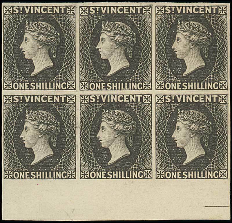 1/- in black on wove paper, a block of six (3x2) with sheet margin at foot, cut close at left, fine. Photo