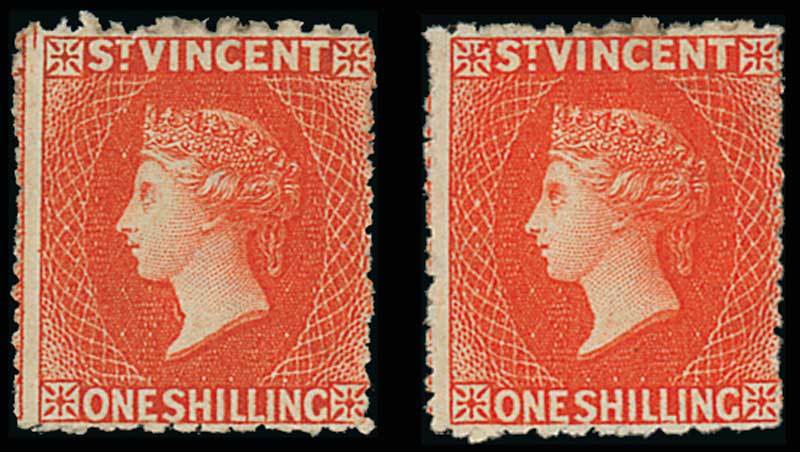 1/- vermilion rejoined pair [6-7], [6] with small part original gum and [7] without gum, shortish perfs. at foot, otherwise fine. B.P.A. Certificates (2007 for both). S.G. 24, £2,000. Photo