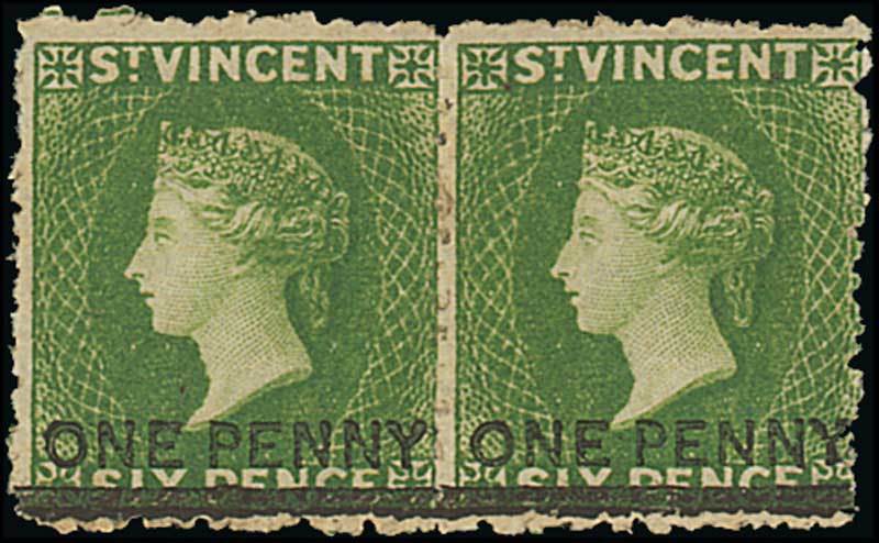 1d. on 6d. bright green horizontal pair, unused with large part original gum. A rare multiple. S.G. 34, £950. Photo