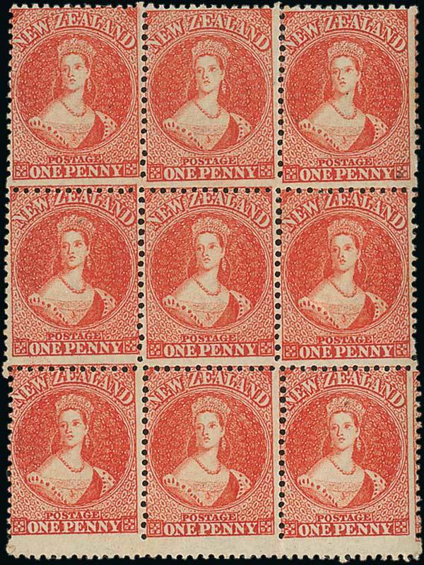 1d. carmine-vermilion block of nine, unused with almost full original gum, superb colour, fine. C.P. A1m(1), $4,050; S.G. 110, £2,025. Photo