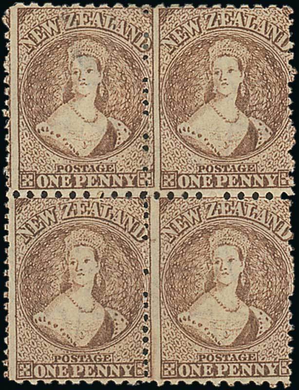 1d. brown block of four, unused with part to large part original gum, the upper left stamp thinned otherwise fine. A very scarce multiple. Holcombe Opinion (1998). C.P. A1p(2), $2,200; S.G. 128, £1,400. Photo