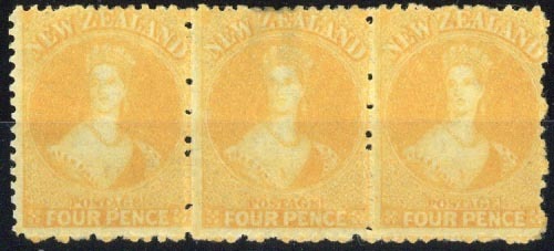 4d. orange-yellow strip of three, fine unused with mainly large part original gum. C.P. A4c, $1,350; S.G. 139, £600