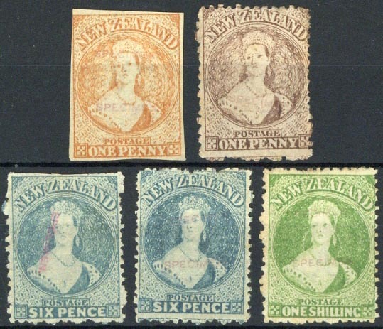 Handstamped "specimen" (Handbook Type C):: In violet on 1864-71 imperf 1d. (no gum) and in red on 1864-71 perf 12½ 1/-, 1871 1d. (very light strike) and 6d. (2, one with perfs cut off at top and without gum)
