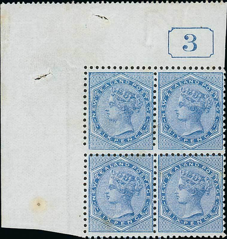 6d. blue, a top left corner block of four showing current number, mounted in the selvedge only, a few minor gum creases and two small holes in margins, otherwise fresh and fine. A rare positional multiple. C.P. C5c[4], $5,500; S.G. 183. Photo