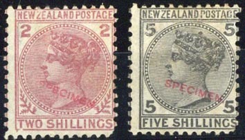 2/- deep rose and 5/- grey, both handstamped "specimen" (Handbook Type B) in red, the former without gum, the latter with small part. S.G. 185-186