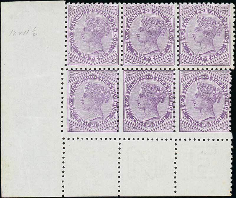 1888-95 7mm. watermark, vertical mesh, perf 12x11½, 2d. lilac Die 3, a lower left corner block of six (3x2) showing dramatically misaligned perforations, mounted in the selvedge only, fresh and fine. C.P. D3c, $1,200; S.G. 196a, £360+. Photo