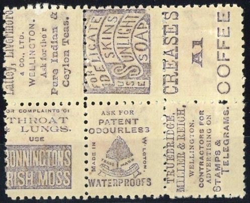 1891-94 7mm. watermark, vertical mesh, perf 10, 1d. rose Die 3 block of six (3x2) with mauve adverts (2nd setting), fresh and fine unmounted mint. C.P. DA2j(4), $360; S.G. 218j, £252