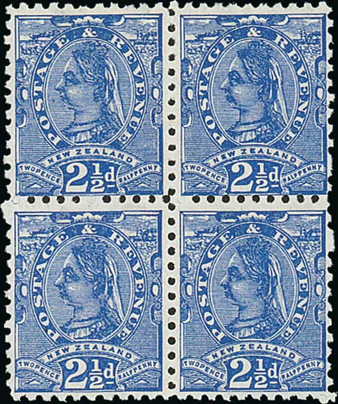 1895-1900 7mm. watermark, vertical mesh, perf 11, 2½d. blue block of four unused with large part or full (lower pair) original gum, lovely colour, fine. C.P. D4j, $600; S.G. 239, £220+. Photo