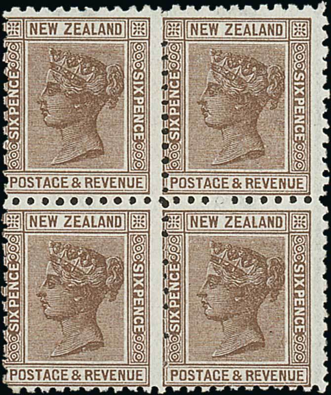 1895-1900 7mm. watermark, vertical mesh, perf 11, 6d. brown block of four, unused with large part or full (lower pair) original gum, fresh and fine. C.P. D8m, $1,200; S.G. 243, £280+. Photo