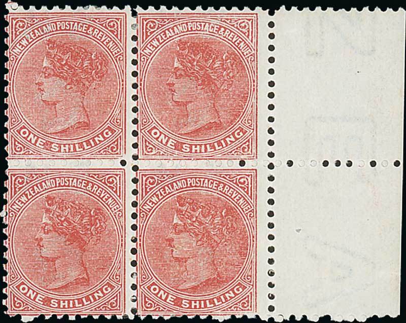 1895-1900 7mm. watermark, vertical mesh, perf 11, 1/- red-brown block of four with margin at right, unused with part original gum, fine. C.P. D10k, $1,000; S.G. 245, £400. Photo