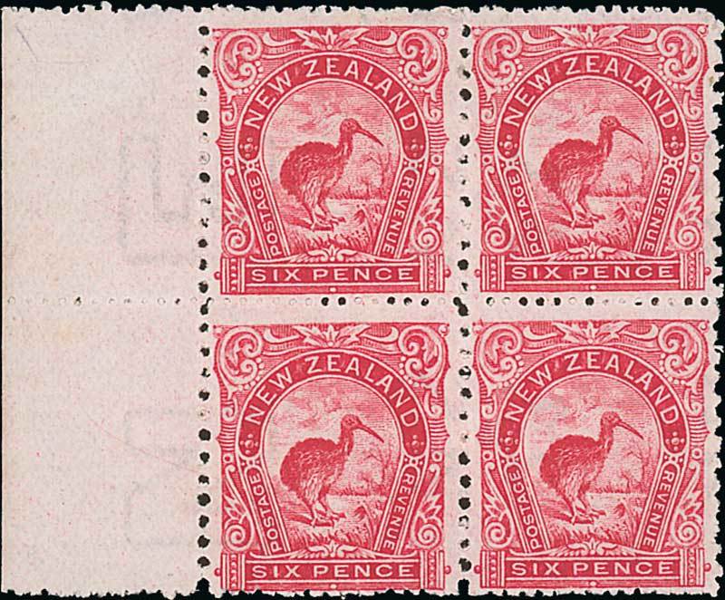 1902-07 "Cowan" paper, perf compound of 11 and 14, 6d. rose-carmine marginal block of four, a few minor gum creases, fine unmounted mint. C.P. E14h, $4,000; S.G. 335, £1,700. Photo
