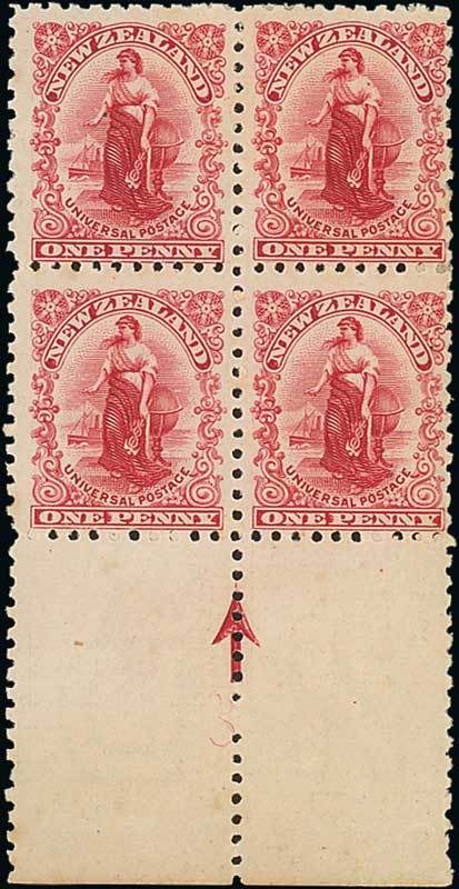 1901 (Feb.-Dec.) "Pirie" paper, perf 11 1d. carmine plate 3 marginal block of four with marginal arrow, fine unused with small to large part original gum, fine. C.P. G2a[4], $5,500; S.G. 278. Photo