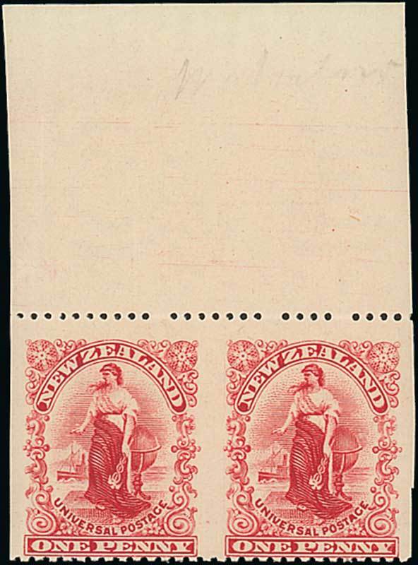 1901 (Feb.-Dec.) "Pirie" paper, perf 14 1d. carmine horizontal pair with sheet margin at top, variety imperforate vertically, fine unmounted mint. C.P. G2b(Z), $1,000; S.G. 280a, £325. Photo