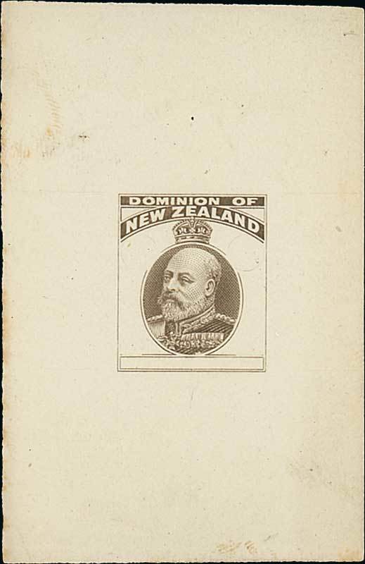 Progressive die proof showing portrait and top label only, in sepia on surfaced wove paper (44x68mm.), traces of soiling clear of impression, fine. Photo
