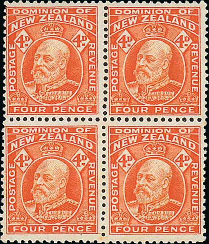 1909-16 4d. orange-red block of four with two different comb perforations, the upper pair with comb head No. 9/111, the lower pair with head 6/No.3, fresh and fine mint. Very rare. Photocopy of RPSNZ Certificate. C.P. H4c, $8,000. Photo