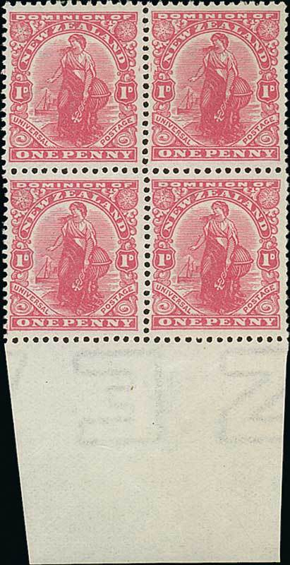 1909-26 Jones chalk-surfaced paper, 1d. pale carmine on unsurfaced paper, a block of four with margin at foot, fresh and fine mint. A rare multiple. C.P. J2a(X), $12,000; S.G. 406a, £1,600. Photo