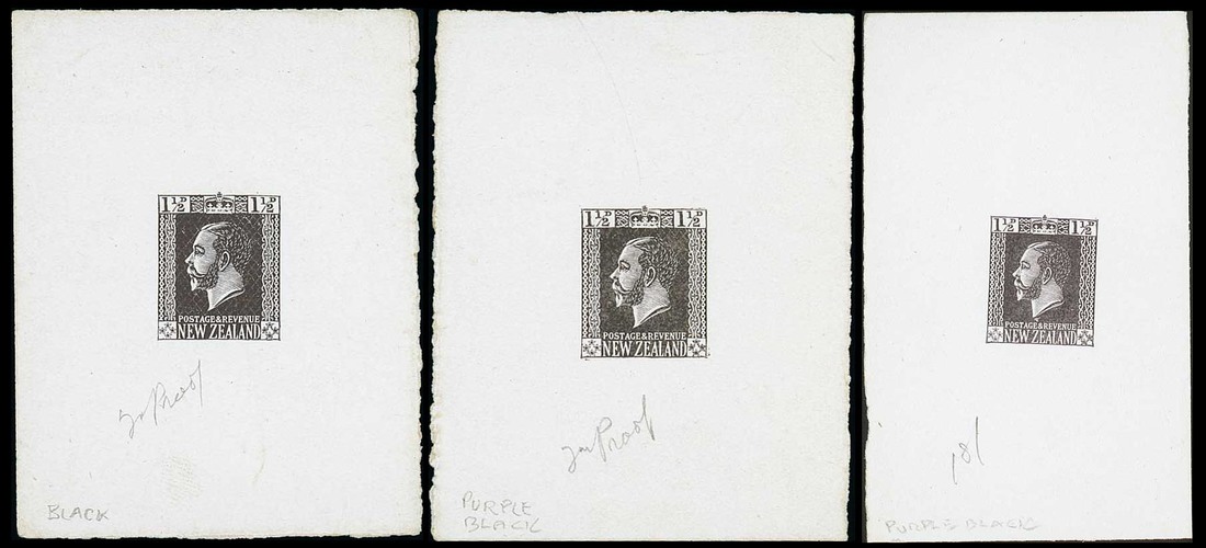 W.R. Brock 1½d. proofs (3) on glazed paper comprising in purple-black marked "1st", in purple-black marked "2nd Proof" and in black marked "2nd Proof", fine. Photo