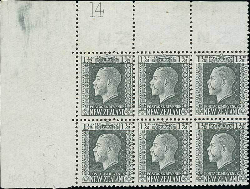 1½d. grey-slate, "Pictorial" paper, a top left corner block of six with complete Plate number "14", the centre vertical row without watermark, fine unmounted mint. C.P. K1d[4], $1,500; S.G. 431/a. Photo