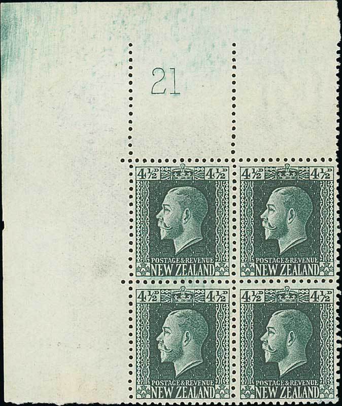 4½d. deep green, "Cowan" paper, a top left corner block of four with Plate number "21", fine mint, mounted in the margin only. C.P. K6a[4], $1,150; S.G. 423. Photo