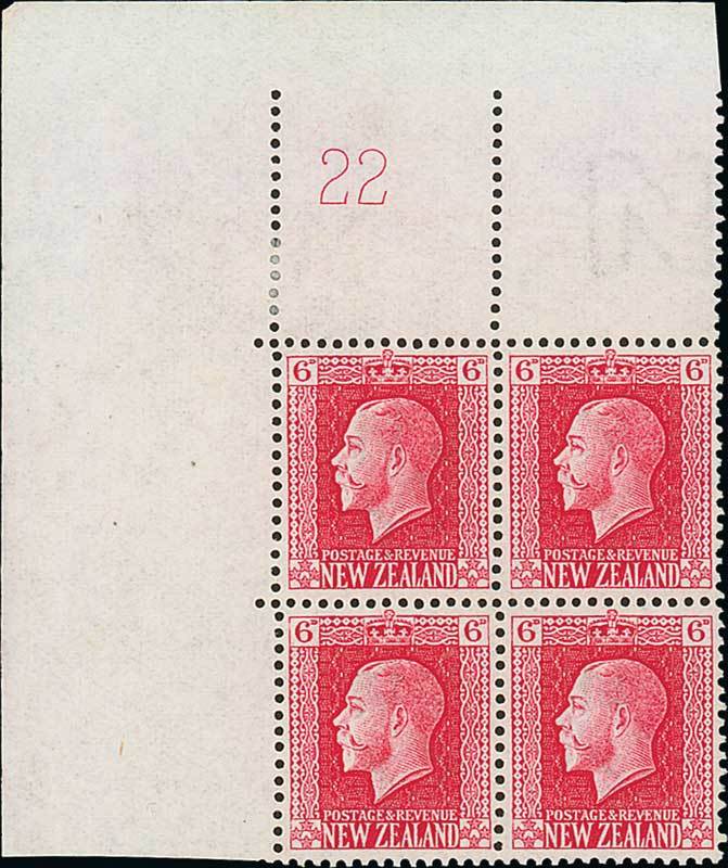 6d. carmine, "Cowan" paper, perf 14x13¼, a top left corner block of four with Plate number "22", fine mint, mounted in the margin only. C.P. K8a[4], $1,250; S.G. 425. Photo