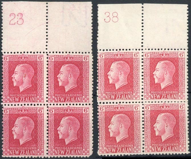 6d. carmine, "Cowan" paper, perf 14x13¼, a block of four (no margin at left) with Plate number "23", mounted in the margin only, the lower right stamp with blunt corner; also a similar block showing Plate number "38", the lower left stamp badly thinned. C.P. K8a[4], $2,600; S.G. 425