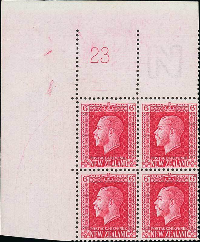 6d. carmine-pink, "Cowan" paper, perf 14x13¼, a top left corner block of four with Plate number "23", fresh and fine unmounted mint. C.P. K8a(3)[4], $1,250. Photo
