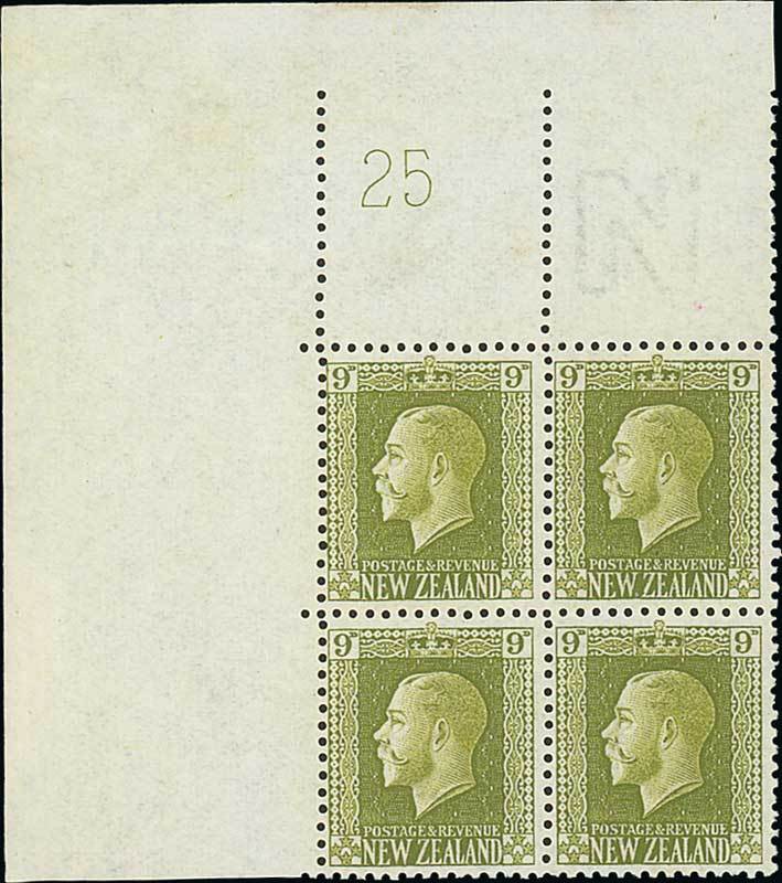 9d. sage-green, "Cowan" paper, a top left corner block of four with Plate number "25", fresh and fine unmounted mint. C.P. K11a[4], $1,500; S.G. 429. Photo