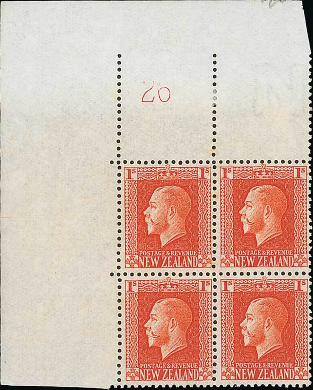 1/- vermilion, "Cowan" paper, a top left corner block of four with Plate number "26", the upper pair with two tiny tone spots on reverse otherwise fine unmounted mint. C.P. K12a[4], $1,800; S.G. 430. Photo