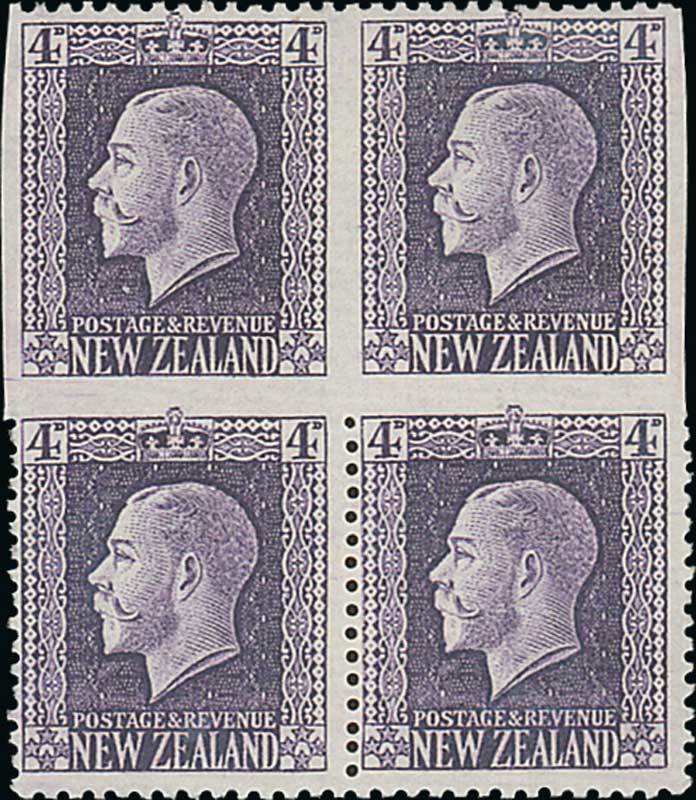 4d. blackish violet block of four from Plate 44, perf 14x14½, variety upper pair imperforate on three sides and base, lower pair imperforate at top, fine mint. A rare multiple of this variety. C.P. K5g(2)(Z), $8,000; S.G. 422ha, £3,000. Photo