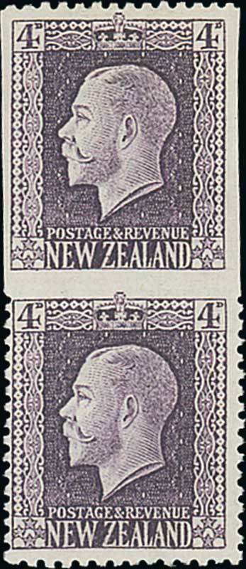 4d. blackish violet vertical pair from Plate 44, perf 14x14½, variety upper stamp imperforate on three sides and base, lower stamp imperforate at top, fine mint. Rare. C.P. K5g(2)(Z), $4,000; S.G. 422ha, £1,500. Photo