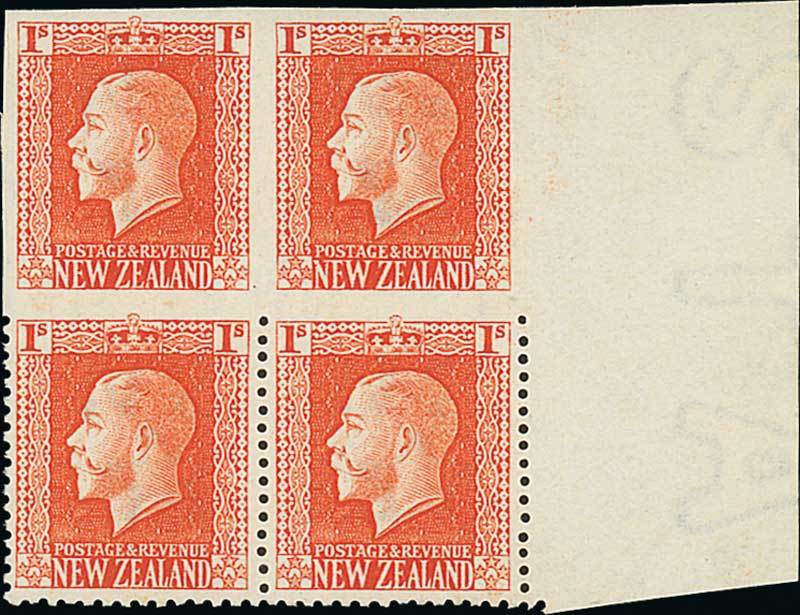 1/- vermilion, perf 14x14¼, a block of four with margin at right, variety upper pair imperforate, lower pair imperforate at top, fine mint, mounted in the margin only. Very rare. C.P. K12a(Y), $10,000; S.G. 430a, £4,000. Photo