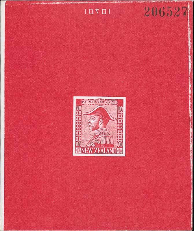 Master die proof in red on glazed paper (87x104mm.) with uncleared value tablets and surround, showing reversed number "10701" at top and printed die number "206527", fine. Photo