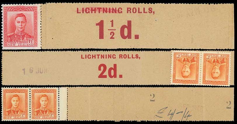 1938-40 1½d. scarlet (2) and 1947-52 2d. orange (2) "Lightning Roll" leaders each with a light datestamp in violet, one of the 2d. is from the public sale in which an additional 4d. per roll was charged, also 2d. strip of four with a close join proving it was from a lightning roll, fine. A very rare group. Photo