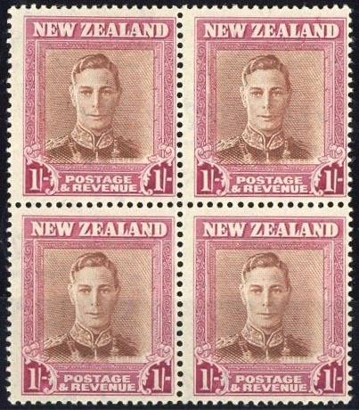 1947-52 1/- red-brown and carmine, Plate 2, a block of four with watermark inverted, fine unmounted mint. C.P. M13c(Z), $1,200; S.G. 686cw, £680