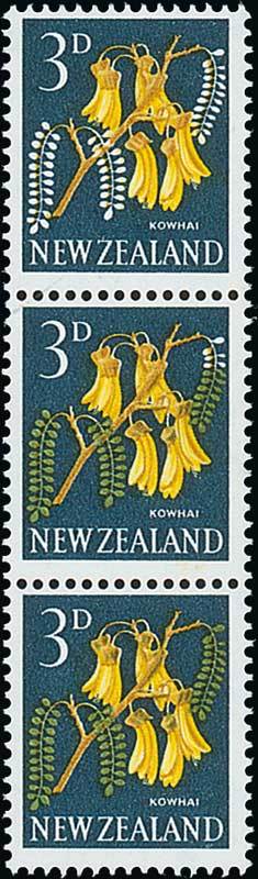 3d. vertical strip of three, the top stamp with green omitted, fine unmounted mint. S.G. 785b, £325. Photo