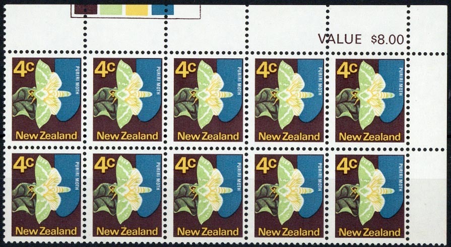 4c., no watermark, a top right corner block of ten (5x2) with colour bars, variety bright green (wing veins) omitted, fine unmounted mint. A scarce positional block. C.P. P6a(Z), $300+; S.G. 1011e