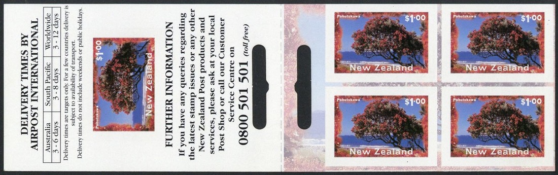 1996 (Aug.) "Pohutukawa" Air Post self-adhesive $5 booklet containing 1996 Scenery $1 pane of four with variety imperforate (die cuts omitted), fine. C.P. W57a(Y), unpriced
