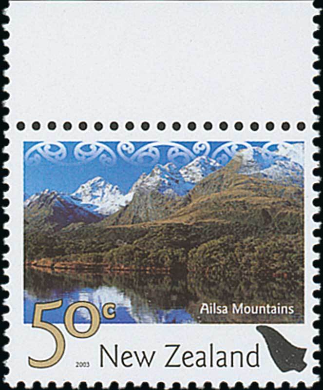 2003 (May) Landscapes, 50c. Ailsa Mountains with variety large solid (no fronds) silver overprint of fern issued in error and recalled, marginal, fine unmounted mint. Rare. With normal for comparison. C.P. PE25b(Z), $3,500. Photo