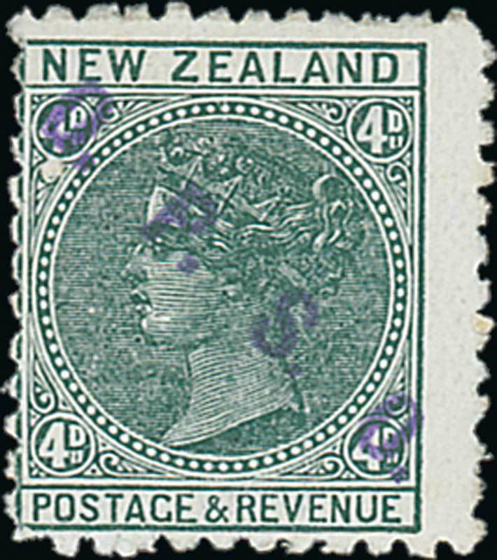 1882-97 4d. green, perf 11, handstamped in violet diagonally downwards, large part original gum, fine. R.P.S. Certificate (1969). Photo