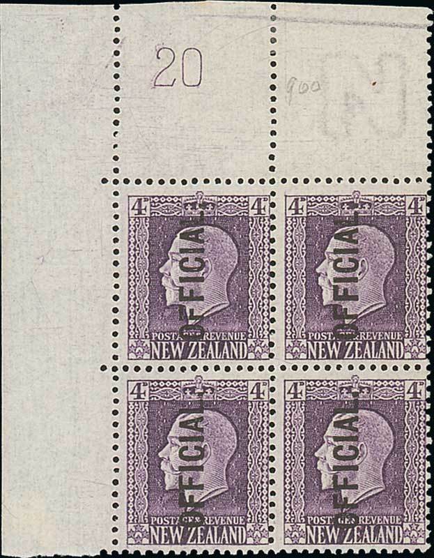 1915-27 Cowan unsurfaced paper, perf 14x13½, 4d. bright violet top right corner block of four with Plate number "20", mounted in the selvedge only, fine unmounted mint. C.P. KO5d[4], $1,000; S.G. O101. Photo