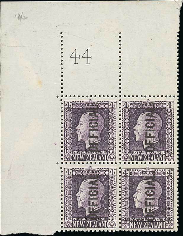 1915-27 Cowan unsurfaced paper, perf 14x14¼, 4d. deep purple top left corner block of four with Plate number "44", mounted in the margins only, fine mint. C.P. KO5g[4], $1,500; S.G. O101c. Photo