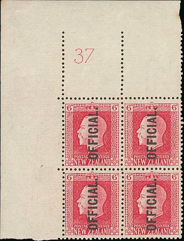 1915-27 Cowan unsurfaced paper, perf 14x13½, 6d. carmine top left corner block of four with Plate number "37", fine unmounted mint. C.P. KO8a[4], $1,100; S.G. O102. Photo