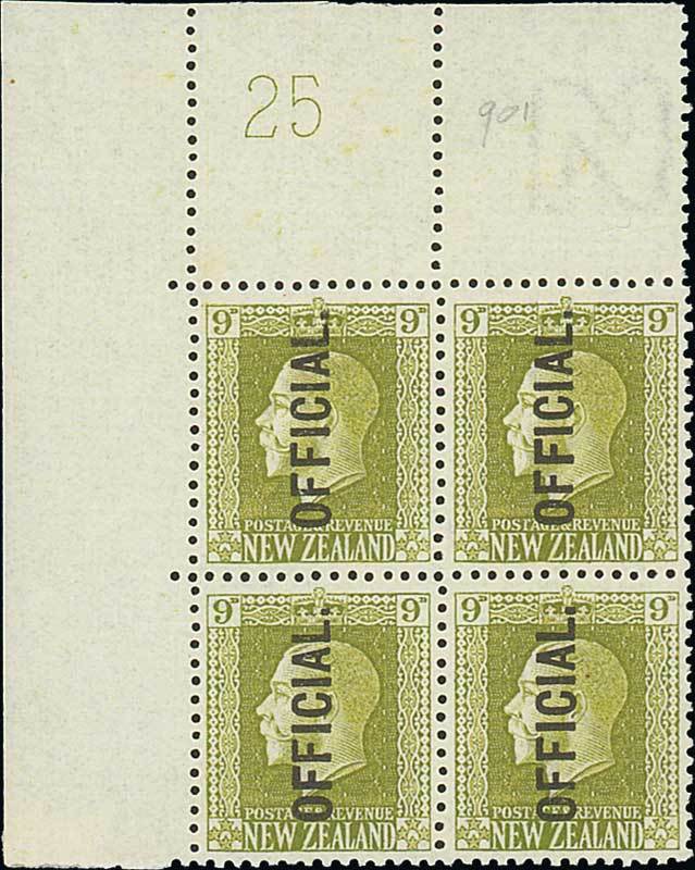 1915-27 Cowan unsurfaced paper, perf 14x13¼, 9d. sage-green top left corner block of four with Plate number "25", mounted in the selvedge only, fine. C.P. KO11a[4], $1,500. Photo