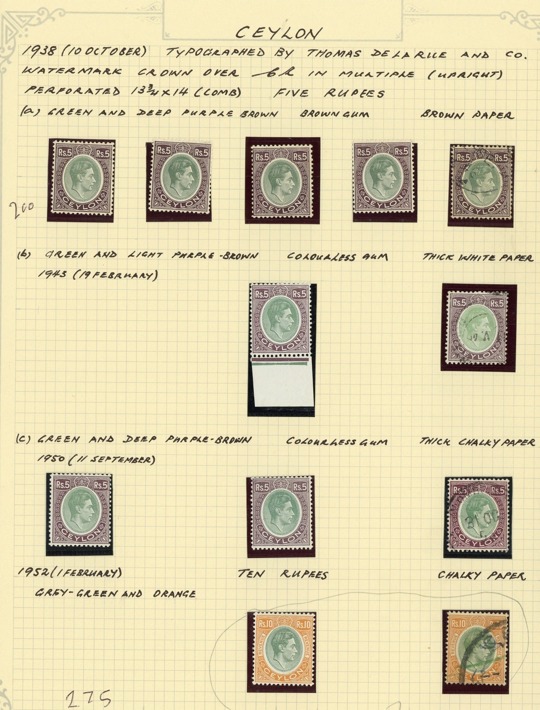 1938-49 issue mint and used collection offering a range of perforation varieties (less only 50c. perf. 13x13½ mint) and shades, some represented by plate or imprint blocks or pairs up to 2r., and Revenue 10r. mint and used; generally good to fine. Stated to cat. c. £1,600