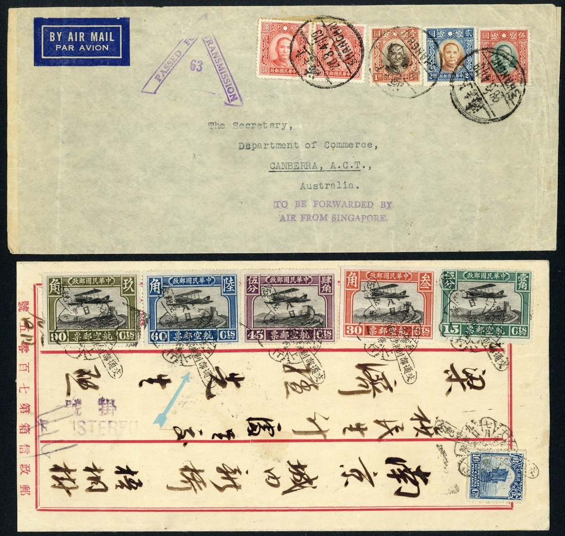 Selection of covers and cards (18), including 1908 postcard with a combination of China ½c. and German Post Offices 2c. on 5c., French Offices, Air Mails, Hong Kong 1936 (27 March) Hong Kong-London Air Mail cover, etc., chiefly good to fine