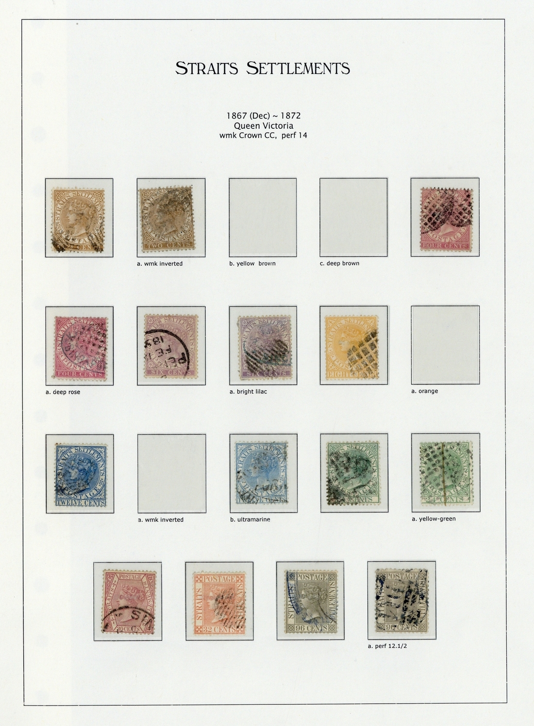 2c. (7, one with watermark inverted), 4c. (5), 6c. (7), 8c. (3), 12c. (4), 24c. (4), 30c.(4), 32c. (4) and 96c. (4, one perf 12½), all used and variously cancelled (one 30c. with Penang c.d.s. in red), a few additionally with firm's chop, condition mixed. S.G. 11-19, £1350+