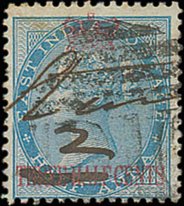 1869 (?) "2" in manuscript on 1½c. on ½a. blue, crossed by part manuscript "Stamped" and cancelled by part "D17" duplex in blue. A fine example of this mysterious rarity. Signed P.L. Pemberton. S.G. 10, £6500. Photo