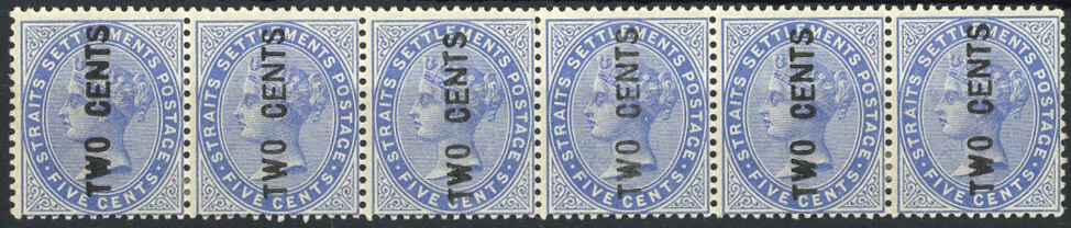 1884 (Aug.) "two cents" on 5c. blue, a strip of six showing Type 20e, fine unused with large part original gum. S.G. 77, £1020
