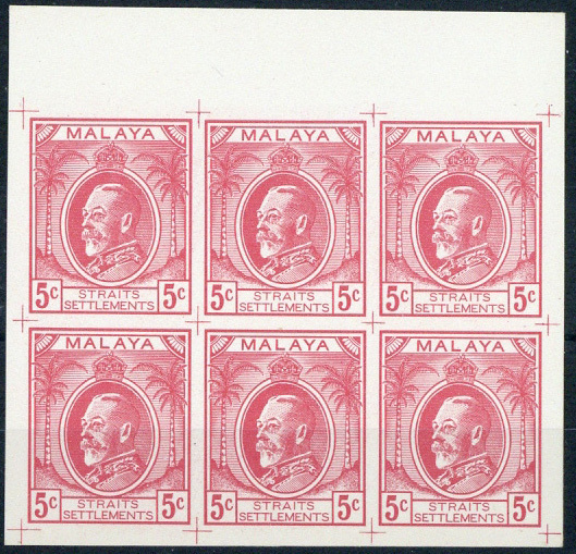 5c. with three-quarter view King George V in uniform, "malaya" in positive lettering on white background and vignette oval half in solid and half cross-hatched, a marginal block of six in pale crimson with guide croses in each corner, fine. (Norris Type U)